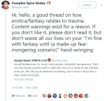 Have you ever seen a twitter thread (or, in this case, two!) that so perfectly expressed everything you’d felt over months and months of harassment persistent? With all credit to @blackblobyellowcone, who is clearly amazing and completely gets it– not just why us women write and read the erotica that we do, but the history behind the censorship we, as a gender, have experienced. Bravo.