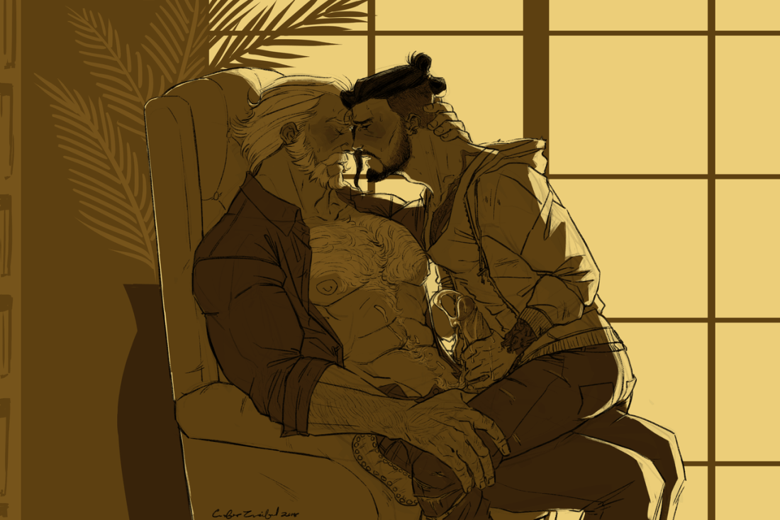 He leans forward, mouth against Reinhardt’s ear, whispering feverishly: “I have seen you looking.” Reinhardt sputters beneath him as if he wants to deny it but then falls very silent. In the corner of his eye, Hanzo can see those big hands slowly flexing where they are placed on the arm rests of the chair. “And you must have seen me looking, too,” he continues, the tips of his ears growing warm with his flush.”