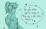 Jack watches her carefully over the rim of his thin, silver rimmed glasses. For a second his pale eyes flinch away and back towards his rifle lying across her desk – adorned with bunny stickers and pictures of her, Lúcio and Zenyatta – then back to her.