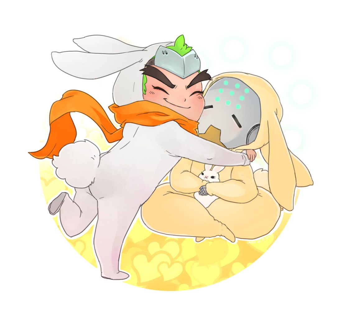 He’s not any of the humans’ genders, but Genji does not seem to mind it any. He still postures for him and shows off his sharp teeth and lovingly bites at the thick cords running half-hidden along Zenyatta’s neck while Zenyatta squeezes carefully the swelling knot at the base of his cock.