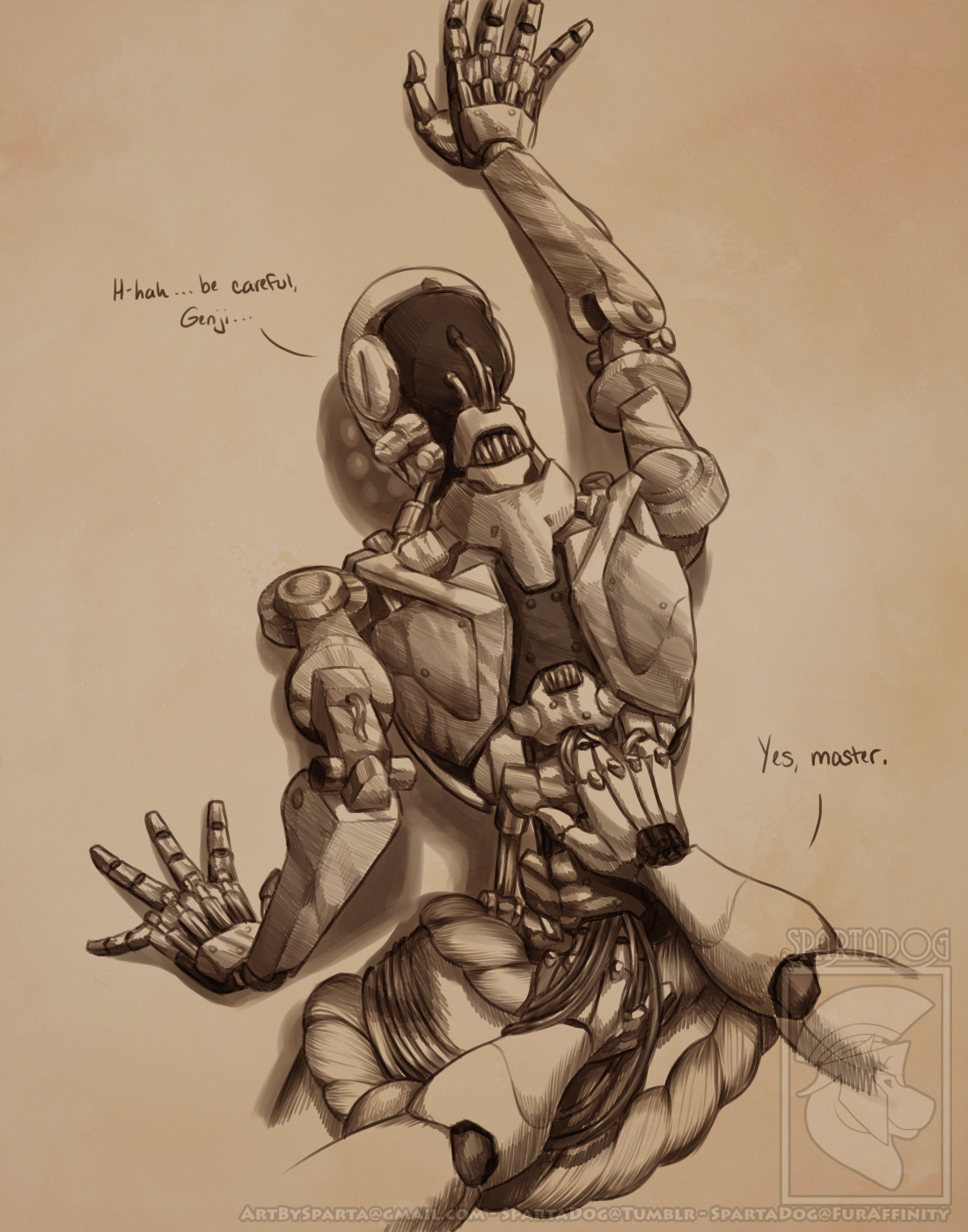 Next in the growing flood of Overwatch fanart, Genji helping his sensei out with some uh…crossed wires. God, Zenyatta has such a pretty back…