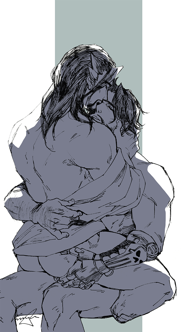 They are both quiet as they chew on that bit. Eventually, Genji rests his head against his big brother’s shoulder and presses his face against the side of his throat.
