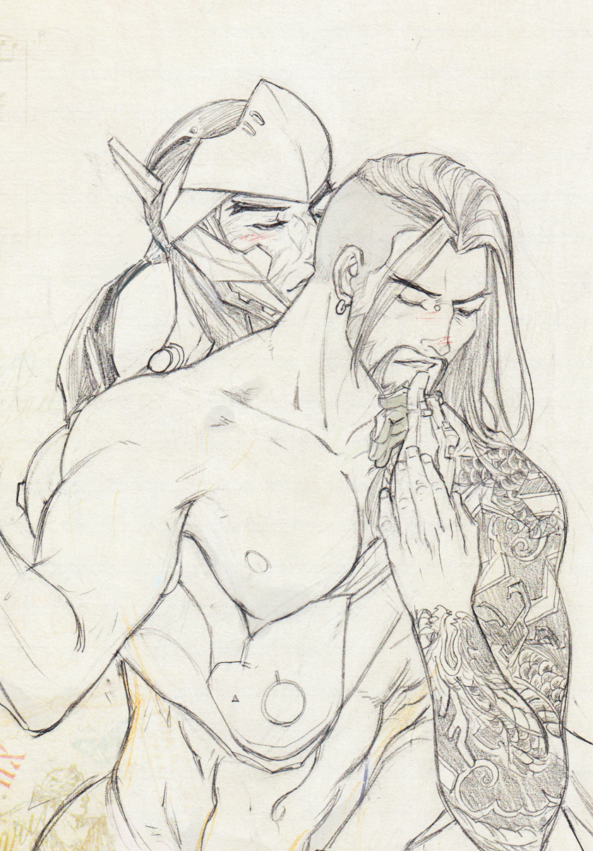 “You’re so dishonorable, brother,” Genji coos, faceplate up, scarred face looking smug as he just has to lay a hand onto his brother’s back to get him to arch for him, hips angling up, the soft pout of his hole wet from Genji’s own excitement beckoning him closer. “Can’t hold your sake…”