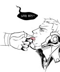 Reaper wonders what the sensors are able to pick up; whether they let Jack smell his dick, so close yet so far – the sweat and musk overwhelming on his senses. He certainly acts like it. He’s whining like a bitch in heat, head coming forwards, nuzzling desperate and clumsy at the cock held out for him while Gabriel taunts: “Come get it, you lazy slut. I did all the work for you – just open your goddamn mouth and take my cock.”