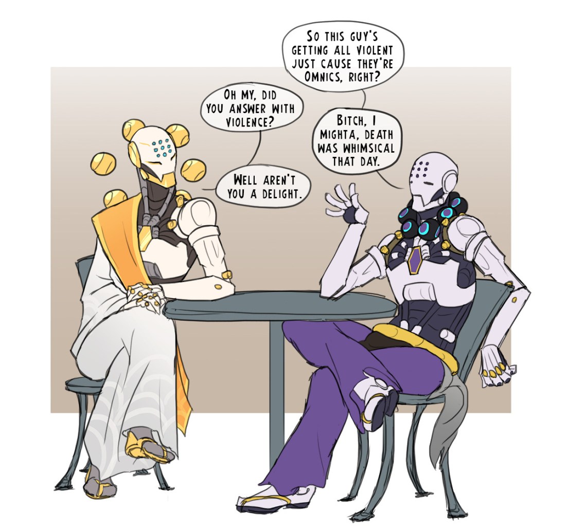 So this was mentioned over on @reversewatch and I needed to draw Reverse Zenyatta and Sassy Zenyatta together immediately, it was important. I just imagine sassy Zenyatta rambling because he senses a kindred spirit of bitchiness.